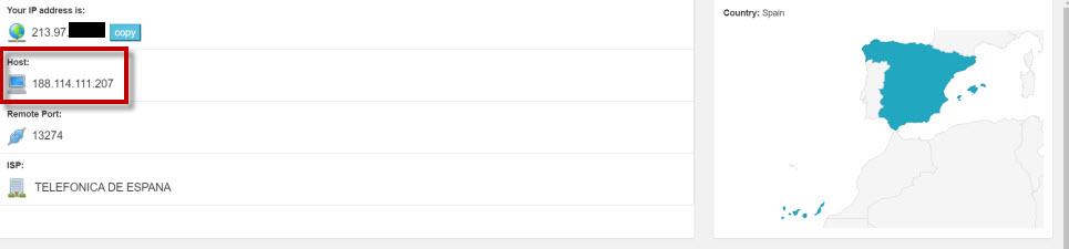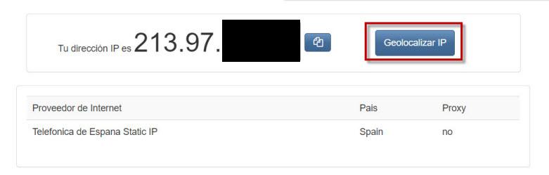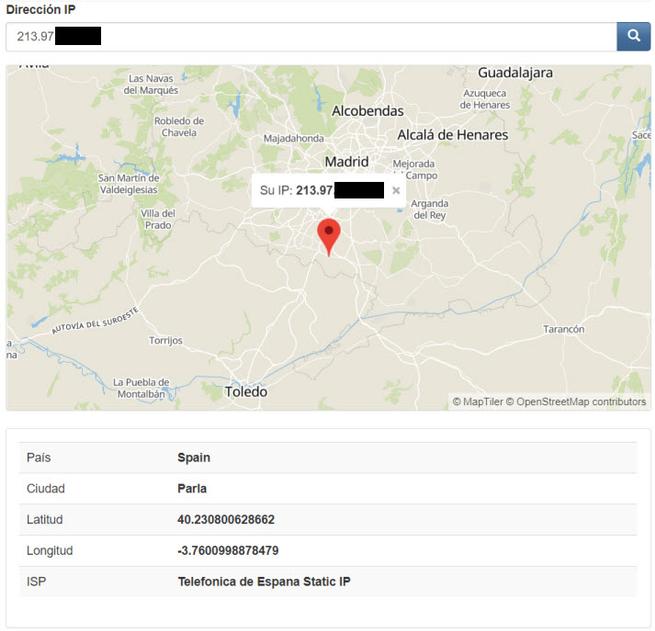 Ici pour commencer, nous savons que l’IP publique est 213.97.xx et que l’opérateur est Telefónica de España. De plus, il nous dit qu’il est statique, depuis l’Espagne et que nous ne naviguons pas via un proxy. Cependant, nous pouvons toujours obtenir plus d’informations en cliquant sur Géolocaliser IP . Ensuite, il nous offrira une localisation plus précise en nous localisant à Madrid dans la ville de Parla également, comme l’outil précédent.