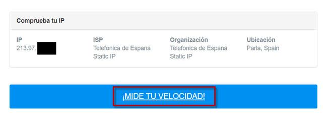 Là, nous obtenons notre IP publique qui est 213.97.xx et aussi le FAI qui est Telefónica. Quant à l’emplacement, comme lors d’occasions précédentes, il nous a localisés en Espagne dans la ville de Parla (Madrid). D’autre part, si nous cliquons sur Mesurez votre vitesse, nous pouvons faire un test pour vérifier que la vitesse de téléchargement et de téléchargement correspond à celle que nous avons contractée.