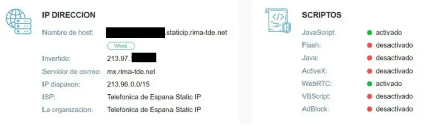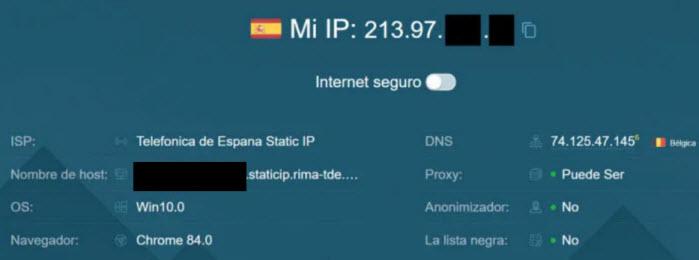 A partir de ces données nous pourrions obtenir notre IP publique qui dans ce cas a la particularité d’être statique. Également des données liées à notre logiciel, nous apprécions ici que nous ayons comme système d’exploitation Windows 10. De plus, il nous indique que nous utilisons Google Chrome en version 84.0. En ce qui concerne le FAI que nous avons contracté, nous voyons que cette ligne provient de Telefónica. Cependant, si nous faisons défiler vers le bas, cela nous offre encore beaucoup plus d’informations.