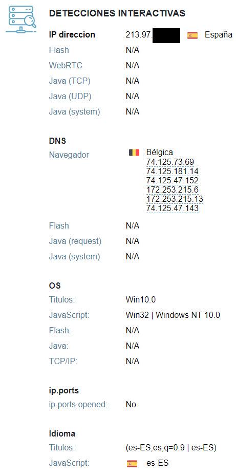Quant à la section des détections interactives, elle indiquera notre adresse IP, que nous avons Windows 10 et que notre langue est l’espagnol.