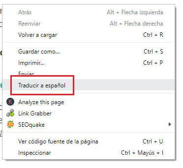 * Note: Une autre option est de cliquer sur le bouton droit de votre souris n’importe où sur la page Web à traduire. Un menu déroulant s’ouvrira automatiquement avec différentes options, cliquez sur » Traduire en espagnol «.