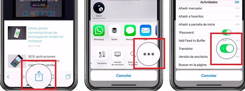 • Activez cet outil pour qu’il fonctionne à partir du navigateur Safari. Pour ce faire, vous devez ouvrir une page Web et cliquer sur le bouton «Partager» , cela affichera une fenêtre avec des options, vous devrez cliquer sur la marge droite et supérieure où trois ellipses apparaîtront, là une autre fenêtre avec des options sera affichée.