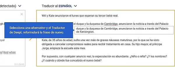 • Écrivez ou copiez le texte que vous souhaitez traduire dans la case de gauche et le texte traduit apparaîtra immédiatement dans la case de droite, dans la langue précédemment sélectionnée. Avec la distinction qu’en cela les mots seront soulignés et lorsque vous cliquerez dessus avec le bouton droit, il affichera une série de synonymes suggérés par le traducteur, où vous choisirez celui de votre préférence en fonction des mots qui donnent une congruence au contexte le rendant authentique au texte original.