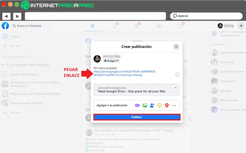 - Ensuite, dans le fil, appuyez sur le champ de texte qui dit «À quoi pensez-vous?» afin d’afficher un nouveau statut. Dans cette section, appuyez pendant quelques secondes pour choisir l’option «Coller» et ainsi, placez le lien depuis Drive.