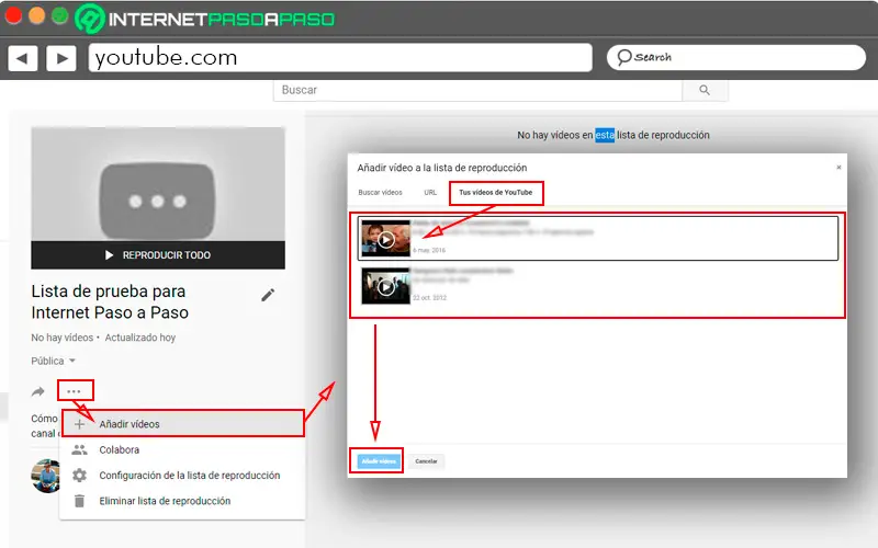 - Une fois cela fait, vous constaterez qu’il ne contient aucune vidéo . Pour en ajouter un ou plusieurs, vous devez cliquer sur les trois points qui se trouvent au-dessus de la description . Suivi par ceci, appuyez sur «Ajouter des vidéos» .