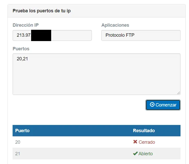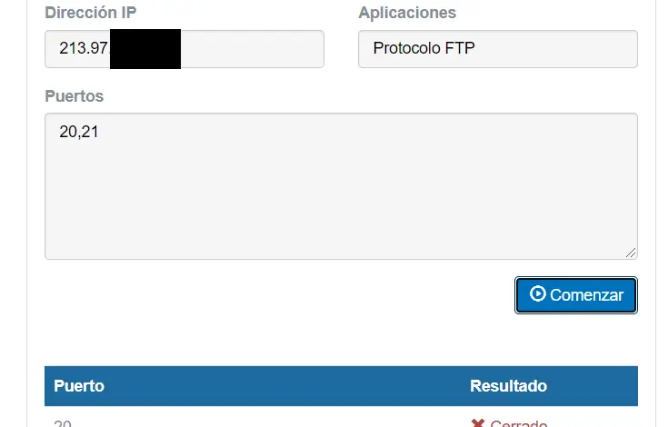 Une fois que nous sommes entrés dans le test de port, la première chose à faire est de mettre notre adresse IP publique si nous y accédons de l’extérieur. Ensuite, nous ajoutons le ou les ports que nous voulons vérifier. Cet outil vous permet de vérifier les plages de ports et d’utiliser également des ports séparés par des virgules. Cette fois nous avons choisi le protocole FTP puis nous avons cliqué sur démarrer .