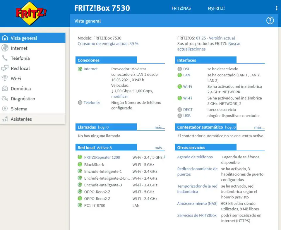 Si nous ne pouvons pas entrer dans la configuration du routeur, nous perdons beaucoup de choses. À ce moment-là, nous devenons un simple utilisateur ou client, la seule chose à faire est de profiter de votre connexion Internet tant qu’il n’y a pas de problèmes. Cependant, si nous prenons en charge notre connexion et prenons le contrôle, les choses changent. Voici par exemple l’écran de configuration avec une vue d’ensemble de la Fritz! Box 7530 :