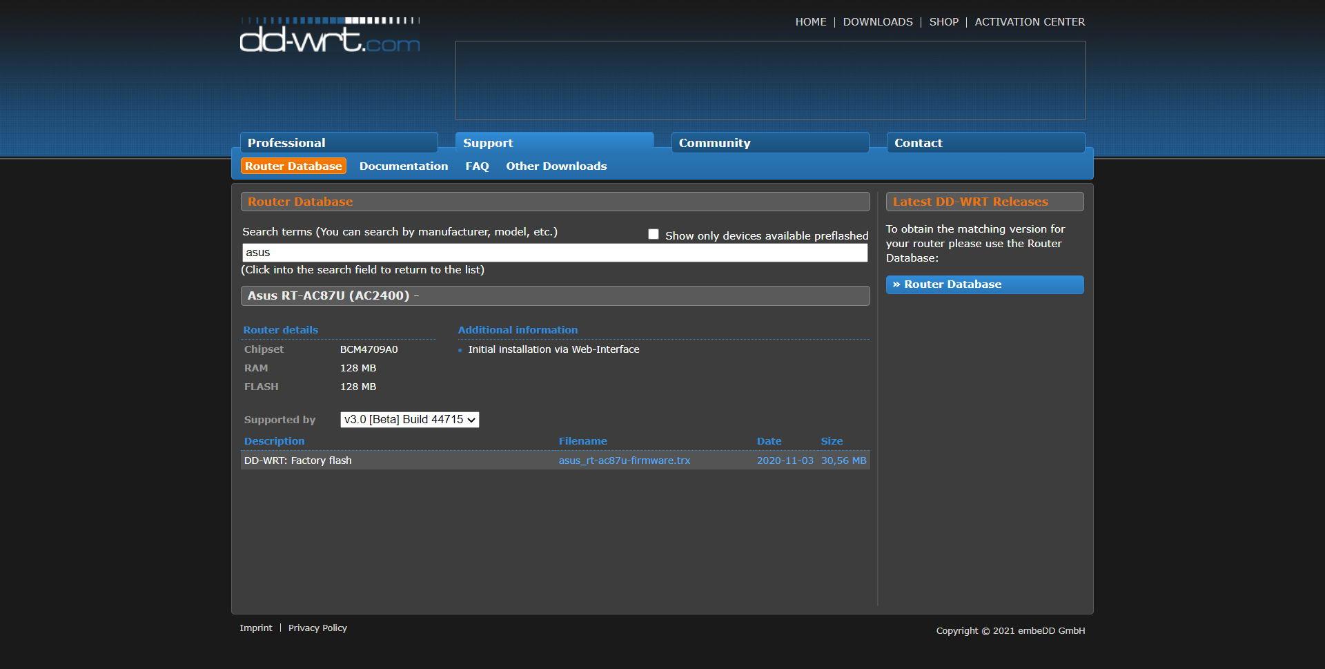 Dependiendo del modelo de router al que queramos instalarle DD-WRT, deberemos instalar un total de 2 firmwares, o solamente uno. Por ejemplo, en el caso del router ASUS RT-AC87U, tenemos un único firmware, tenemos que descargarlo y posteriormente cargarlo al router como si fuera el firmware oficial. En la sección de «Administración / Firmware» deberemos cargar de manera manual el firmware, y esperar unos 3 minutos hasta que esté disponible.