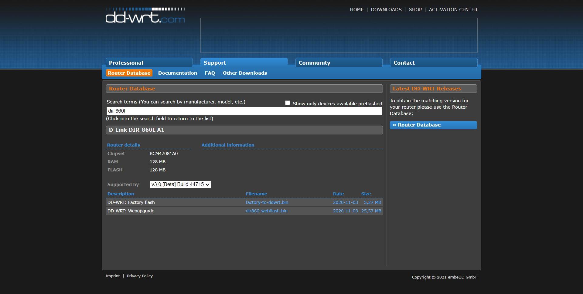 En el caso del router D-Link DIR-860L, debemos descargarnos los dos firmwares que nos brinda la web oficial. Primero deberemos flashear en el router el firmware llamado «factory-to-ddwrt», como si fuera un firmware normal y corriente. Una vez flasheado, tendremos un «mini» DD-WRT instalado, y una vez que tengamos acceso vía web al nuevo firmware DD-WRT, entonces es cuando ya cargaremos el firmware completo que hemos descargado.