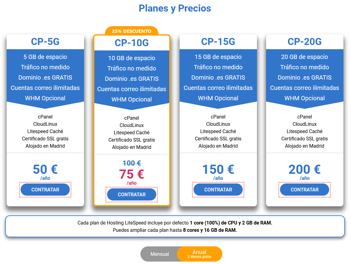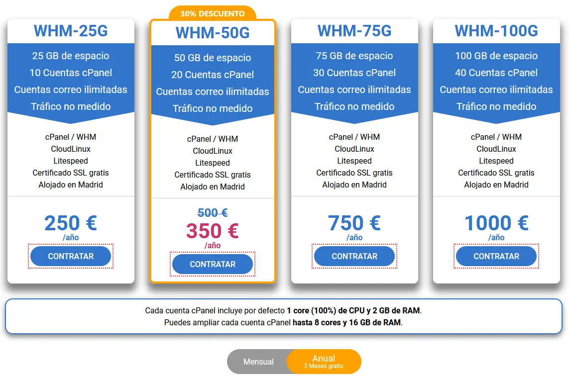 Comme son nom l’indique, grâce au fait qu’il soit «élastique», nous pourrons étendre et réduire les cœurs du processeur et la mémoire RAM de manière dynamique et quand nous le voulons. Si nous sommes des revendeurs d’hébergement Web, nous pouvons également contracter ces plans pour attribuer dynamiquement différentes ressources à nos clients telles que le processeur, la RAM et même le disque, grâce au WHM installé par défaut. Chaque compte cPanel est livré par défaut avec 1 cœur et 2 Go de RAM, nous pouvons demander une extension jusqu’à 8 cœurs et 16 Go de RAM pour faire face à l’avalanche de visites sur notre site Web, car la capacité n’est pas illimitée, mais limitée au matériel lui-même serveur physique où le web est hébergé. Si vous avez besoin de plus de 8 cœurs, vous devez acheter un VPS directement.