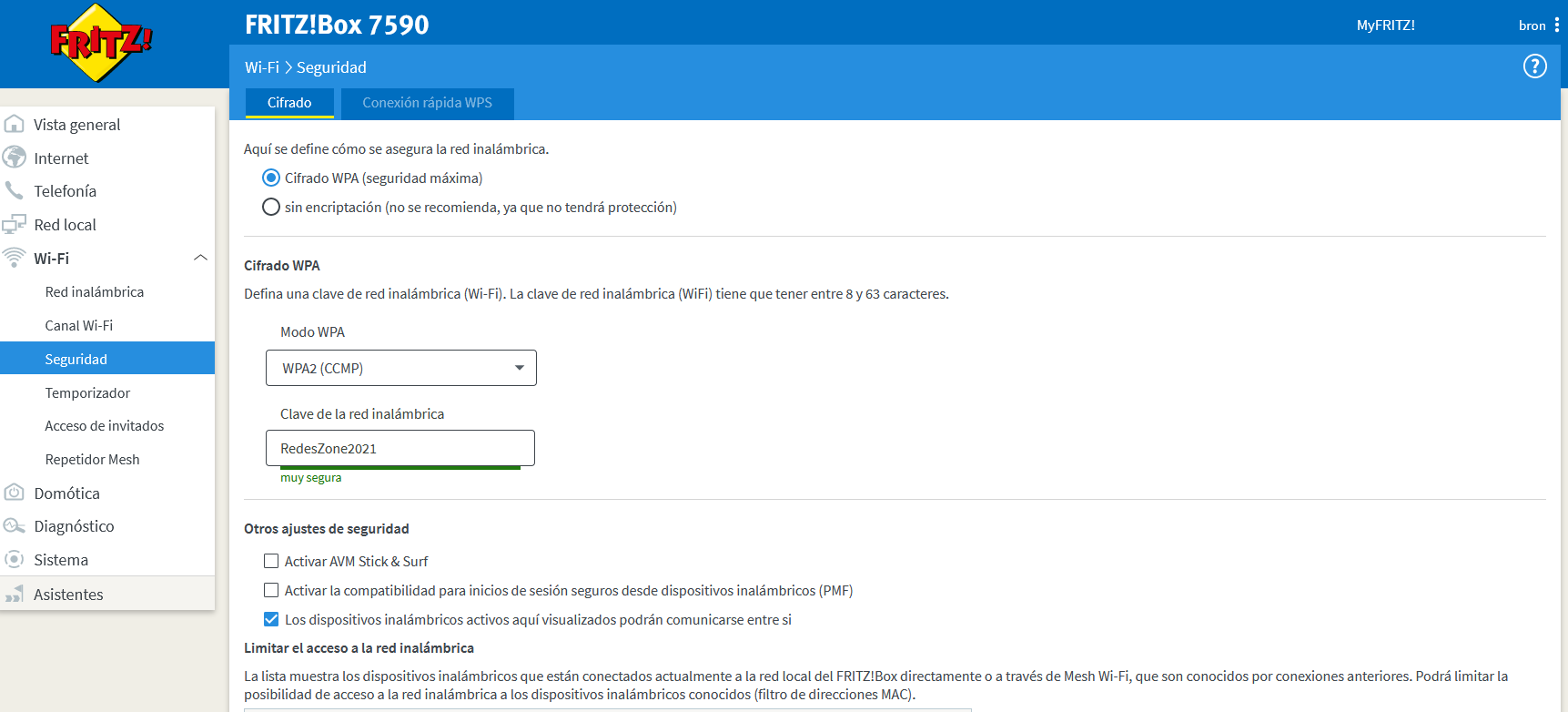 Dans le cas d’autres routeurs très avancés et recommandés, tels que l’AVM FRITZ! Box, nous avons également cette option de configuration disponible pour le réseau principal. Dans ce cas, si nous activons l’isolation AP, cela affectera les deux bandes de fréquences (ce qui serait normal, nous sommes intéressés à rendre cette option disponible dans les deux bandes). La configuration dans ce routeur est très simple, nous activons la configuration avancée du routeur dans la partie supérieure droite, et nous allons dans la section «Wi-Fi / Sécurité» et nous pouvons voir l’option «Les périphériques sans fil actifs affichés ici pourront communiquer entre eux «, si nous désactivons cette option, nous activerons l’isolation AP.