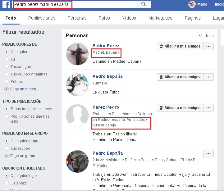 Autrement dit, dans la barre de recherche, vous devez entrer la ville où se trouve cette personne. Par exemple, si vous recherchez Pedro Pérez qui vit à Madrid, dans la barre de recherche, vous devez entrer «Pedro Pérez Madrid Espagne» . De cette façon, vous verrez tous les résultats des personnes portant ce nom qui vivent dans la capitale espagnole.