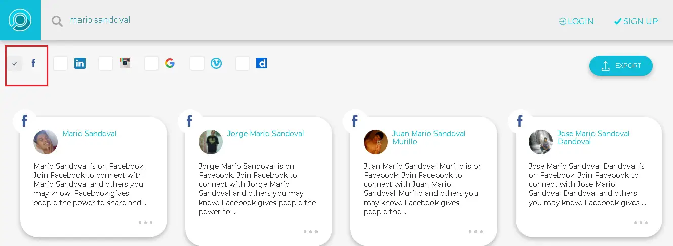 Ce que vous devez faire, c’est entrer sur le site Web de l’outil et entrer le nom de la personne que vous recherchez dans l’espace correspondant et cliquer sur «Utilisateurs» qui indique que vous recherchez des utilisateurs. Après cela, vous devez cliquer sur «Facebook» pour déterminer que vous souhaitez effectuer la recherche sur ce réseau social spécifique . Après cela, vous verrez tous les profils avec ce nom qui existent.