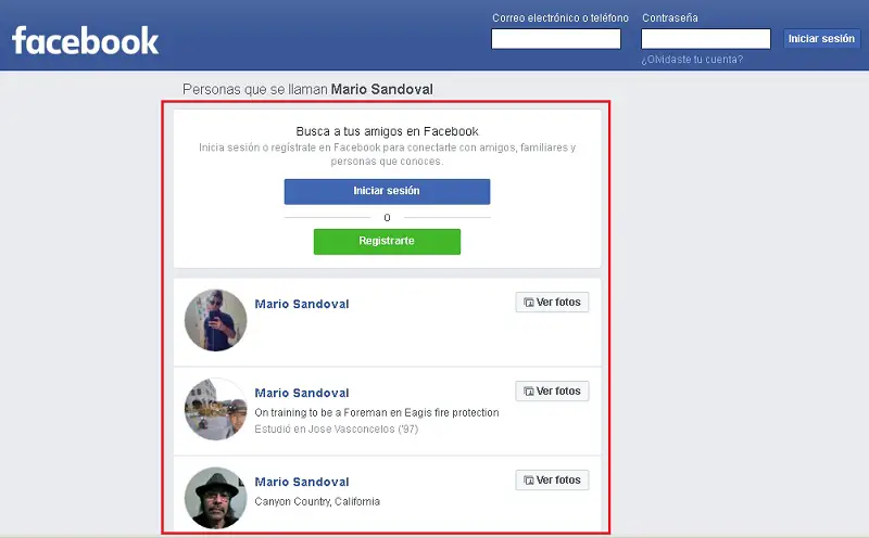 Par exemple, si vous recherchez Mario Sandoval, qui vit au Venezuela et a étudié dans une université, vous devez taper dans la barre de recherche «Mario Sandoval + Facebook Venezuela University» et appuyer sur Entrée. Vous entrez le premier résultat qui sort et vous recherchez parmi les profils qui correspondent à votre recherche.