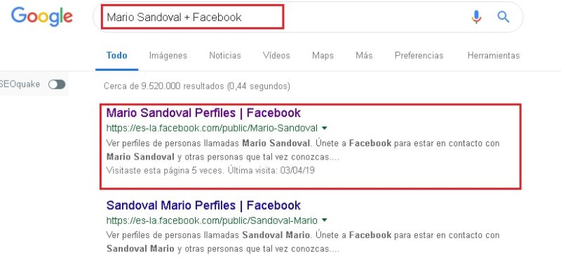 Vous devez être ingénieux pour effectuer cette recherche et surtout vous devez connaître certaines informations spécifiques sur la personne que vous recherchez, sans cela ce sera pratiquement impossible. Ce que vous devez faire est de placer le nom de la personne suivi du signe plus (+), du mot Facebook et d’autres informations , qui peuvent être le collège ou l’université où elle a étudié, son emploi ou sa ville d’origine.