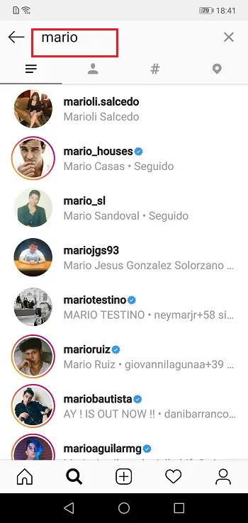 Depuis le mobile , il faut toucher la «Loupe» qui apparaît dans le menu d’options qui se trouve en bas de l’écran du mobile, qui correspond à la section «Explorer». Après cela, cliquez là où il est dit «Rechercher» en haut, qui est également accompagné d’une loupe. Dans cet espace, vous devez inscrire le nom complet de la personne que vous recherchez, ou au moins son prénom et son nom.
