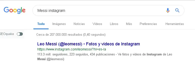 Ce que vous devez faire est d’écrire le nom de la personne ou son nom d’utilisateur suivi du mot Instagram . De cette façon, le profil que vous recherchez sera affiché dans le premier résultat. De plus, s’il s’agit d’une célébrité, vous avez l’avantage que Google vous montrera son profil officiel et vous n’aurez pas à faire face aux centaines de faux comptes qui existent éventuellement à son nom.
