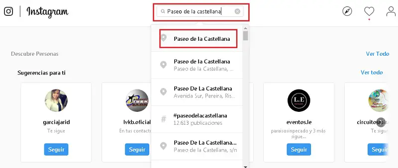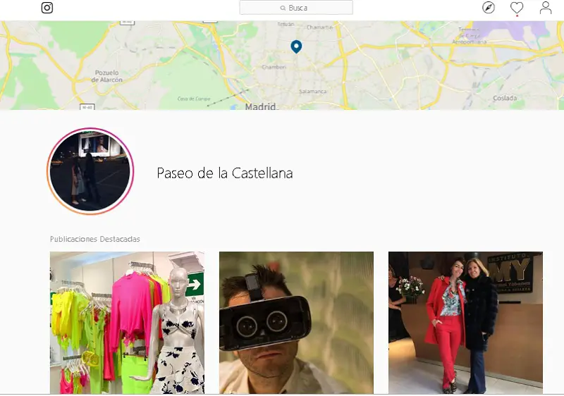 Ce que vous devez faire pour trouver leur profil est simplement de rechercher par l’emplacement où la photo a été prise. Pour ce faire, il vous suffit de taper «Paseo de la Castellana Madrid» dans la barre de recherche depuis votre mobile ou votre navigateur Web et voir les résultats. Si la fille que vous avez vue a publié la photo sur son profil et a précisé qu’elle l’a fait depuis cet endroit , vous pouvez sans aucun doute la retrouver parmi les publications les plus récentes.