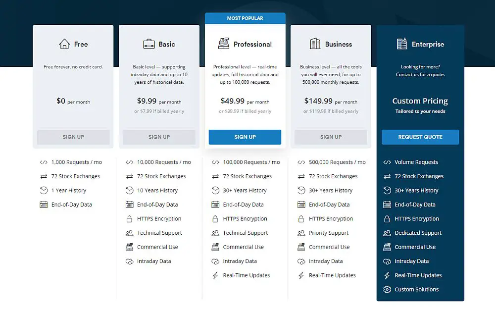 - Entreprise – Obtenez un devis – Si vous recherchez des solutions personnalisées, le niveau Entreprise de Marketstack supprime toutes les barrières et ouvre la porte à l’innovation. Toutes les ressources dont dispose Apilayer sont à votre disposition pour identifier et satisfaire vos besoins de la manière la plus rentable.