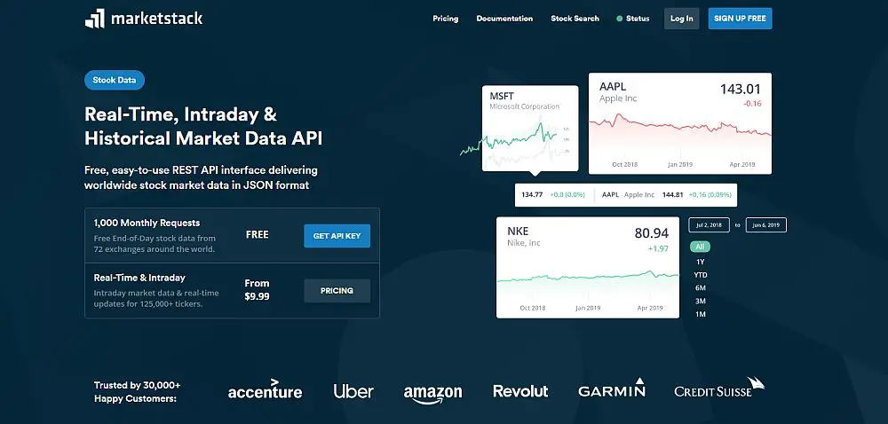 Avec ces performances évolutives et ces ensembles de fonctionnalités, Marketstack est utilisé par les nouveaux venus dans les entreprises multinationales. En fait, plus de 30000 entreprises font partie de la clientèle de Marketstack, notamment Microsoft, Accenture, Amazon, Credit Suisse, Uber, Accenture, Revolut, etc. Il est également largement utilisé dans les cercles universitaires, avec plus de 75 universités, dont le MIT et NYU.