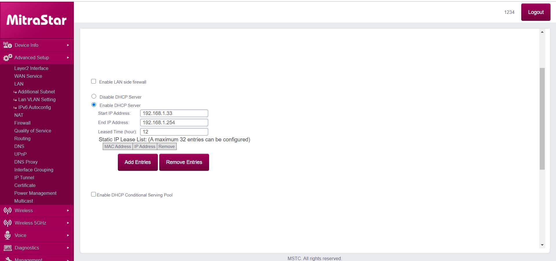 De cette façon, nous pouvons activer ou non DHCP dans le routeur. Cependant, nous avons une fonctionnalité supplémentaire qui consiste à configurer le DHCP statique. Pour ce faire, nous devons aller en bas et cliquer sur Ajouter une entrée. Plus tard, nous devrons mettre l’adresse MAC et l’IP où nous sommes intéressés. Nous donnons Appliquer / Enregistrer et les modifications seront appliquées. Nous pouvons ajouter jusqu’à un maximum de 32 entrées.