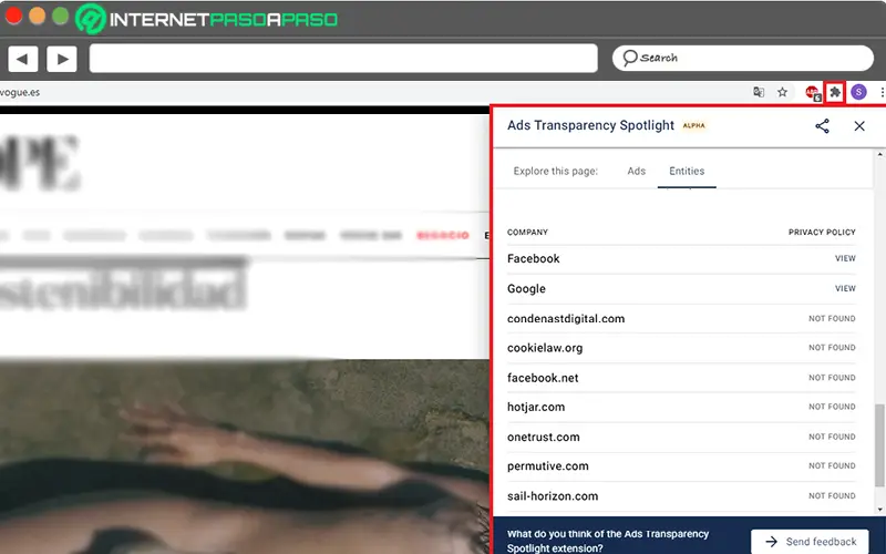 Ensuite, lorsque vous êtes sur le site en question, vous devez activer l’extension Google pour obtenir les informations souhaitées. Pour ce faire, allez dans le coin supérieur droit de la fenêtre, cliquez sur Extensions et cliquez sur «Ads Transparency Spotlight (Alpha)» et en quelques secondes, il vous montrera une petite fenêtre qui, en bas, contient le nom de entreprises qui paient pour la publicité vue là-bas .