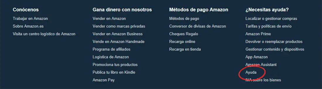 Ainsi, une fois le site officiel d’ Amazon , si nous descendons, nous verrons quatre colonnes avec des raccourcis vers d’autres sections du site d’intérêt. Dans la quatrième colonne, nous trouverons l’accès à l’ aide , situé à l’avant-dernière place, afin de parler avec un assistant Amazon . Suivez les étapes ci-dessous: