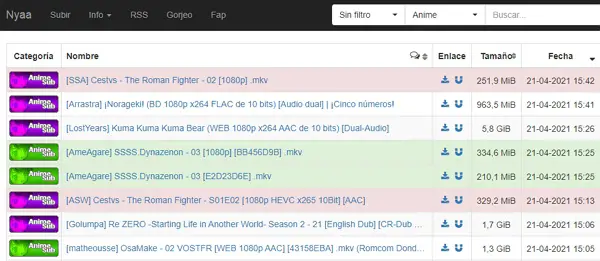 Il fonctionne comme un moteur de recherche ou de suivi de fichiers torrent spécialement créé pour trouver du contenu d’anime japonais . Donc, si ce type de séries vous convient, avec Nyaa.si (https://nyaa.si/) vous aurez à portée de main un excellent outil avec des centaines d’options parmi lesquelles choisir. Son interface est très simple à comprendre et, bien que son design laisse à désirer, ce site va droit au but en proposant une liste de possibilités sur son écran principal.