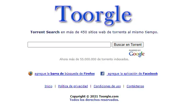 Toorgle est un autre portail qui fonctionne comme un méta-moteur de recherche. Ce site Web recherche et analyse rapidement plus de 450 sites différents , offrant des résultats sur n’importe quel sujet. Maintenant, il est important de préciser que ceux-ci n’ont pas été analysés auparavant, vous devez donc être prudent lorsque vous choisissez l’un des fichiers disponibles.