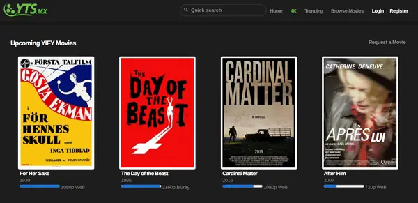 YTS est un site Web assez complet qui offre le meilleur du cinéma et de la télévision en qualité HD dans le confort de votre maison. Avec cette page, vous pouvez choisir entre regarder du contenu en ligne ou le télécharger sur votre ordinateur pour le diffuser sur un écran plus grand à l’aide d’un appareil tel que Chromecast. Il offre une apparence moderne, avec une série de boutons qui permettent à l’utilisateur de rechercher facilement des séries ou des films.