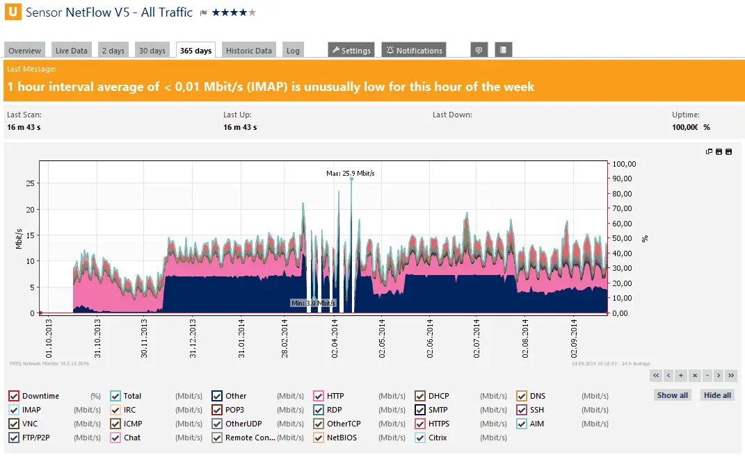 Le PRTG Network Monitor de Paessler AG est une solution tout-en-un dont l’objectif principal est de surveiller l’utilisation de la bande passante. Il est également utilisé pour surveiller la disponibilité et l’état des différentes ressources réseau. Ces fonctionnalités en font un outil utile pour les administrateurs réseau. L’outil peut surveiller les appareils sur plusieurs sites et peut surveiller les services LAN, WAN, VPN et cloud. En utilisant le capteur approprié, il peut également être utilisé comme collecteur et analyseur NetFlow.