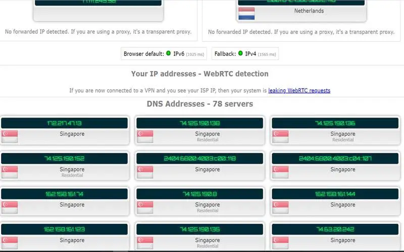 Si nous effectuons ce test et qu’une IP espagnole apparaît mais que nous avons un VPN configuré pour se connecter depuis un autre pays, quelque chose ne va pas. Dans nos tests, nous avons utilisé un VPN connecté à Singapour. Nous sommes entrés dans IP Leak et l’exécution du test indique que nous sommes à Singapour.
