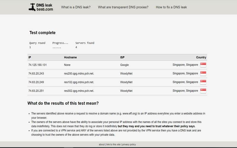 Un cas similaire est le DNS Leak Test . La façon dont cela fonctionne est la même que ci-dessus. Il suffit d’entrer dans la page et de lancer le test. Il effectuera une série de tests et nous montrera d’où nous sommes connectés.