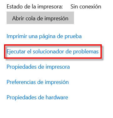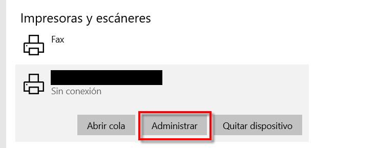 La première chose que nous allons faire est de vérifier que dans Windows 10, nous avons l’ imprimante que nous allons utiliser par défaut. Si ce n’est pas résolu, nous allons dans «Paramètres, Périphériques, Imprimantes et scanners». Là, sélectionnez votre imprimante et cliquez sur Gérer . Nous obtiendrons un écran comme celui-ci :