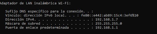 C’est parce qu’il n’y a pas de débouché sur Internet. Observons ce qui suit : si nous allons à l’ invite de commande (cmd) dans Windows , nous pouvons corroborer les données IP de base en fonction du routeur Wi-Fi auquel nous sommes connectés : donnée IP de