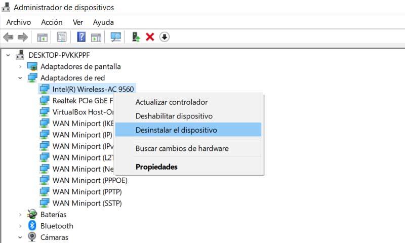 Au-delà de la mise à jour des pilotes et si le problème persiste, la prochaine étape que nous devons franchir est de réinstaller la carte. Pour cela, nous allons dans Démarrer, nous écrivons Device Manager et plus tard, nous entrons dans Network Adapters. Là, nous devons sélectionner l’adaptateur réseau sans fil, cliquer sur le bouton droit de la souris et cliquer sur Désinstaller . Plus tard, le système le réinstallera.