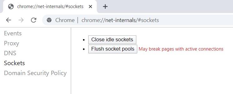 Si nous voulons également nettoyer toutes les connexions actuellement actives dans Chrome, nous pouvons aller dans la section « Sockets » que nous avons sur le côté gauche, et cliquer sur « Rincer les pools de sockets ».
