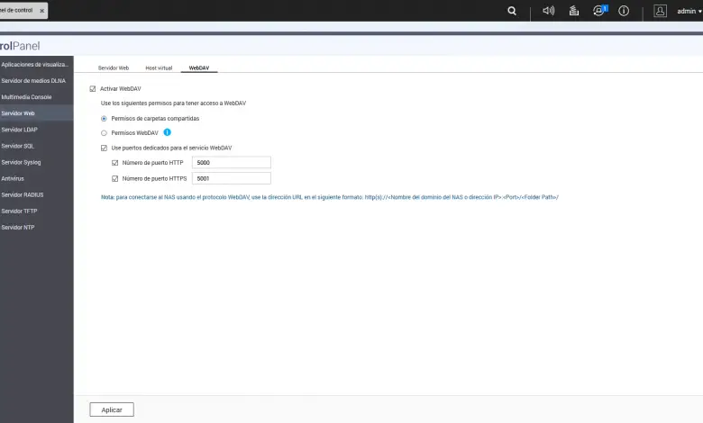 - Ports : WebDAV est compatible avec les protocoles HTTP et HTTPS, selon le protocole, nous pouvons définir le port par défaut (80 et 443) ou en choisir des spécifiques pour WebDAV.