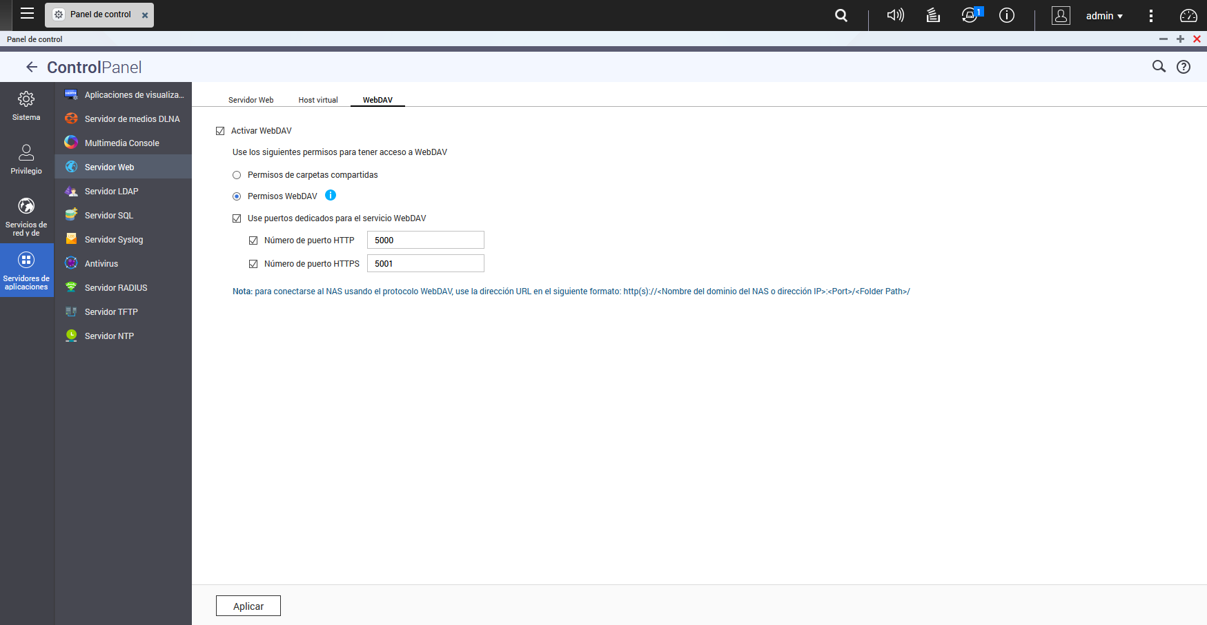 Configurer un serveur WebDAV sur un serveur NAS QNAP est vraiment simple, il suffit d’aller dans « Panneau de configuration / Serveurs d’applications / Serveur Web / WebDAV «. Une fois là, il faut activer le serveur WebDAV, puisque, par défaut, il est désactivé. Ensuite, nous aurons plusieurs options :