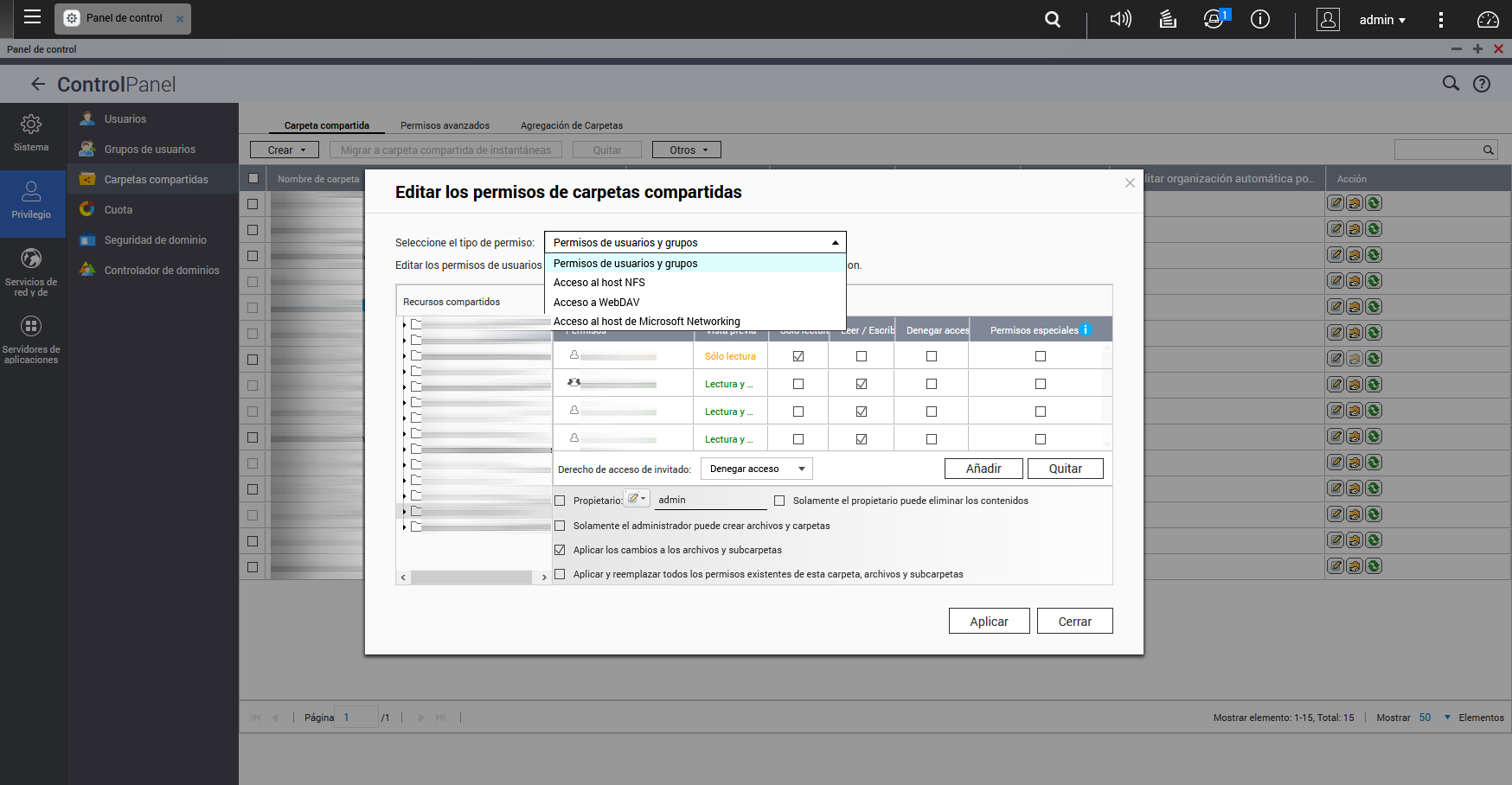 Nous allons dans la section » Panneau de configuration / Privilège / Dossiers partagés «, et cliquons sur » Modifier les autorisations des dossiers partagés «, pour afficher ultérieurement l’option » Sélectionnez le type d’autorisation » et choisissez » Accès à WebDAV «. Cette option est uniquement disponible au choix, tant que nous avons choisi «Autorisations WebDAV» sur le serveur WebDAV, sinon elle n’apparaîtra pas.