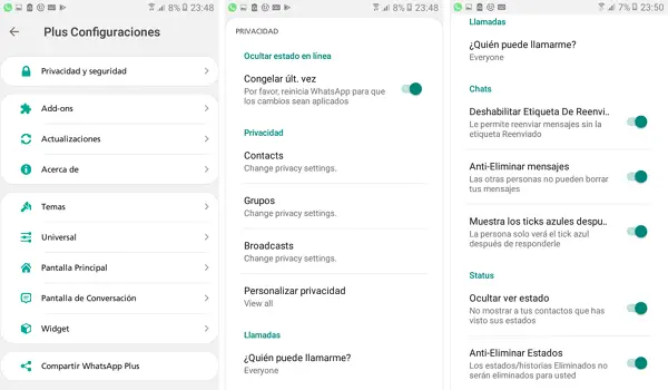 Une autre fonctionnalité incroyable de WhatsApp plus est celle qui élimine le «en ligne» , ce qui vous permettra de naviguer et de discuter avec qui vous voulez, sans que vos contacts puissent voir que vous êtes à l’intérieur de l’application, même s’ils utilisent l’officiel application.