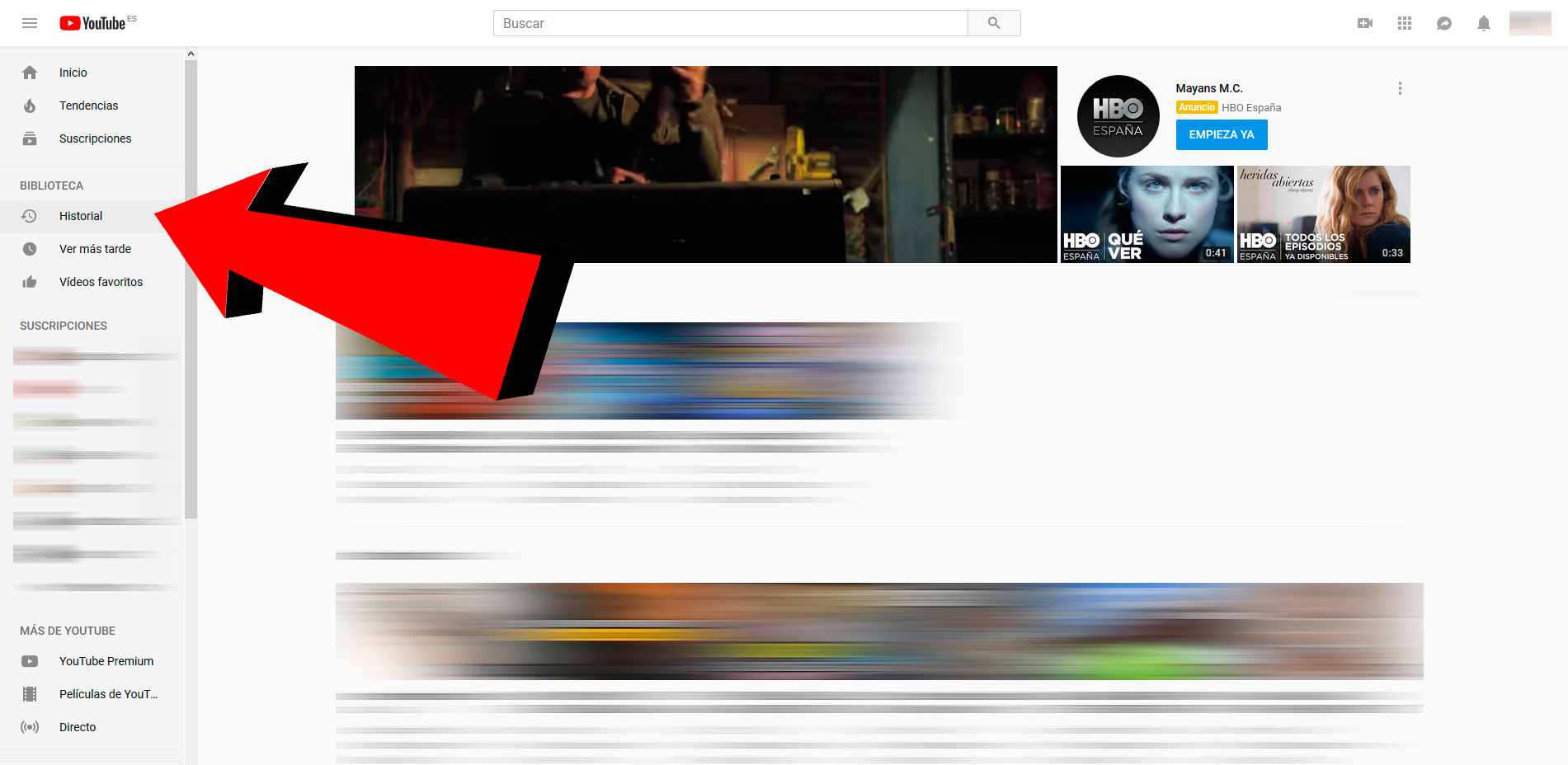 Encore une fois, il faut aller sur le site officiel de YouTube et cliquer sur l’icône du menu principal sous la forme de trois bandes horizontales. Et encore une fois, nous devons accéder à l’option Historique , située dans le groupe Bibliothèque .
