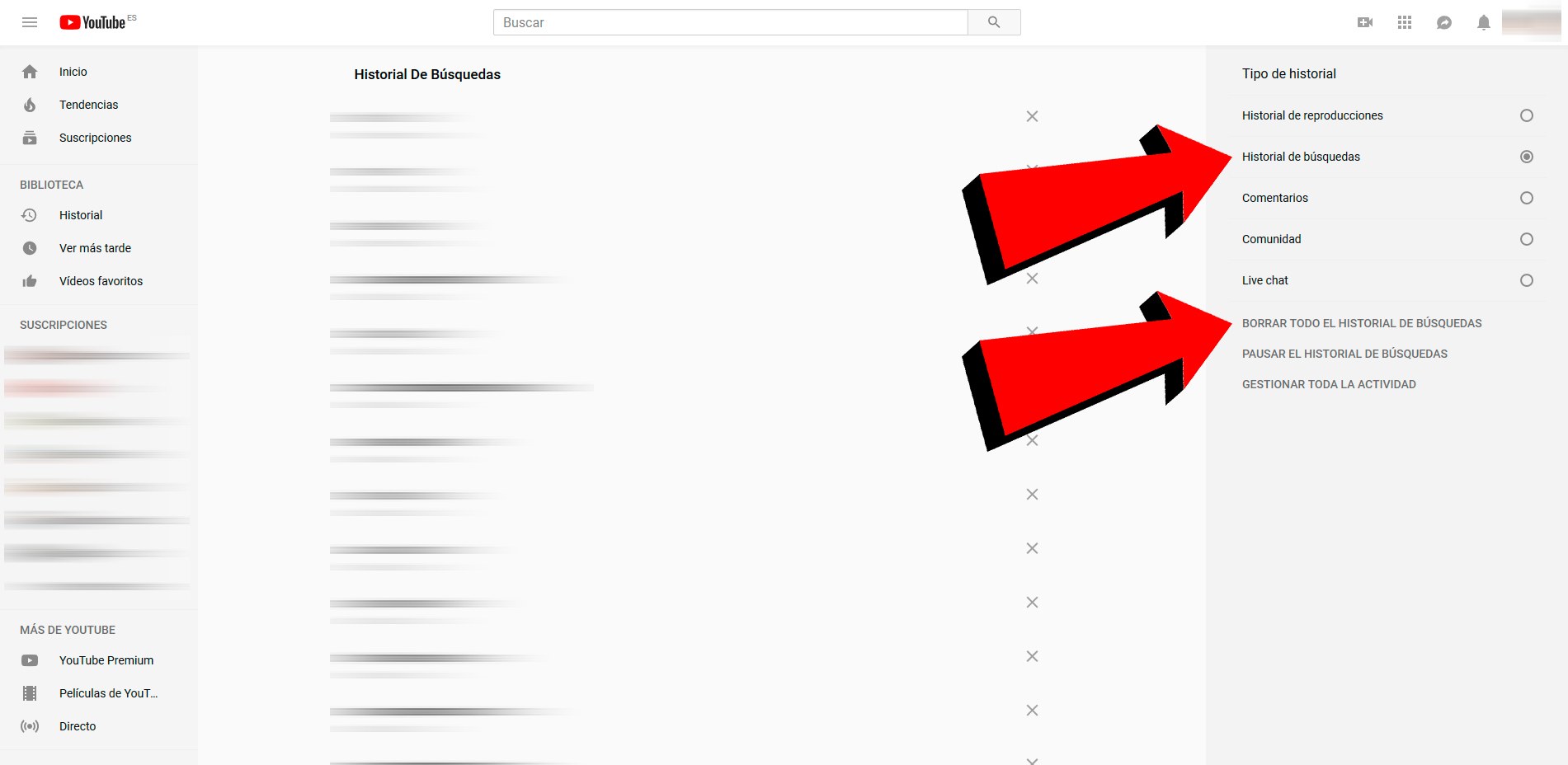 Déjà dans l’historique, nous devons sélectionner l’option Rechercher dans l’ historique dans la colonne de droite sous l’en-tête Type d’historique . Dans la colonne de gauche, nos dernières recherches enregistrées par la plateforme YouTube apparaîtront, avec une icône en forme de X à droite de chacune, ce qui nous permettra de supprimer une par une en cliquant sur chaque X. Pour supprimer toutes les recherches sur le Une fois que nous n’avons plus qu’à cliquer sur l’option Supprimer tout l’historique de recherche , également située dans la colonne de droite.