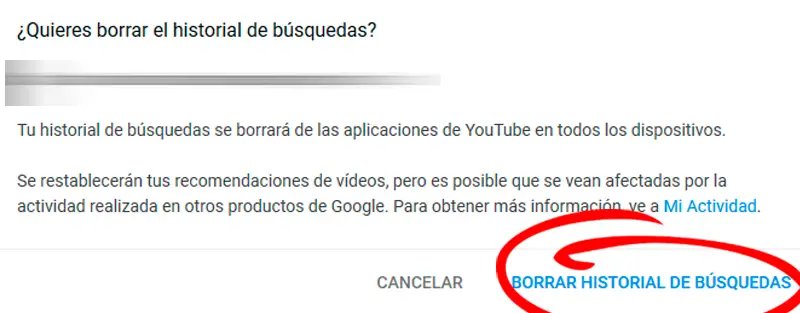 Si nous cliquons sur cette option, une fenêtre pop-up apparaîtra nous demandant si nous voulons vraiment effacer tout l’historique de recherche YouTube et les répercussions sur cette décision, telles que la répercussion sur nos recommandations vidéo. Si nous voulons supprimer l’historique, il suffit de confirmer en cliquant sur Supprimer l’historique de recherche .