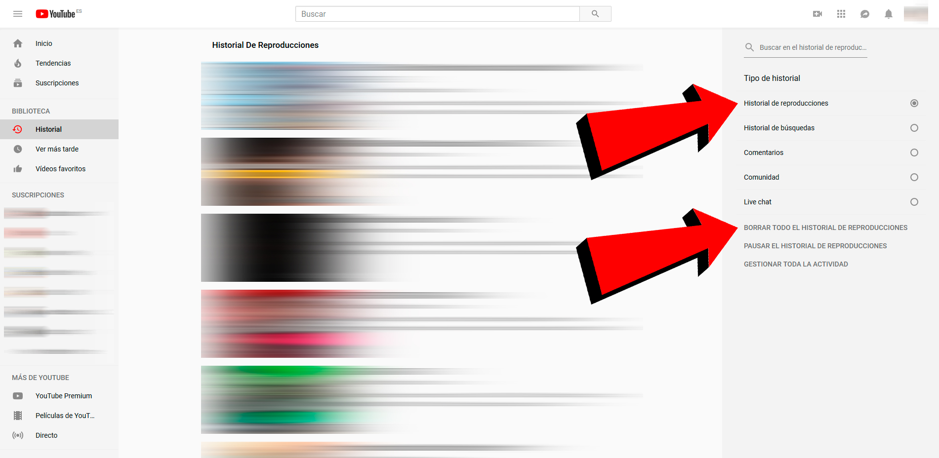 Une fois dans l’ historique , il faut sélectionner l’option Historique de lecture , située dans le groupe de types Historique . Encore une fois, dans la colonne de gauche, nous verrons nos dernières reproductions; Si nous voulons effacer l’ Histoire des reproductions, il suffit de cliquer sur l’entrée Supprimer toute l’histoire des reproductions , située dans la colonne de droite.
