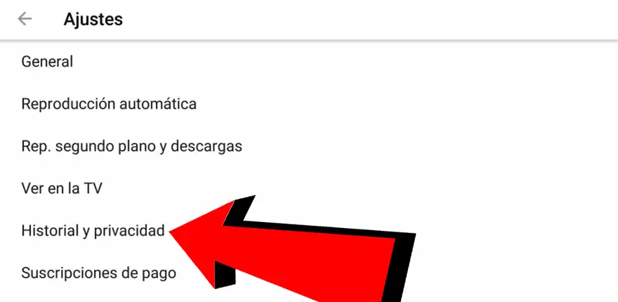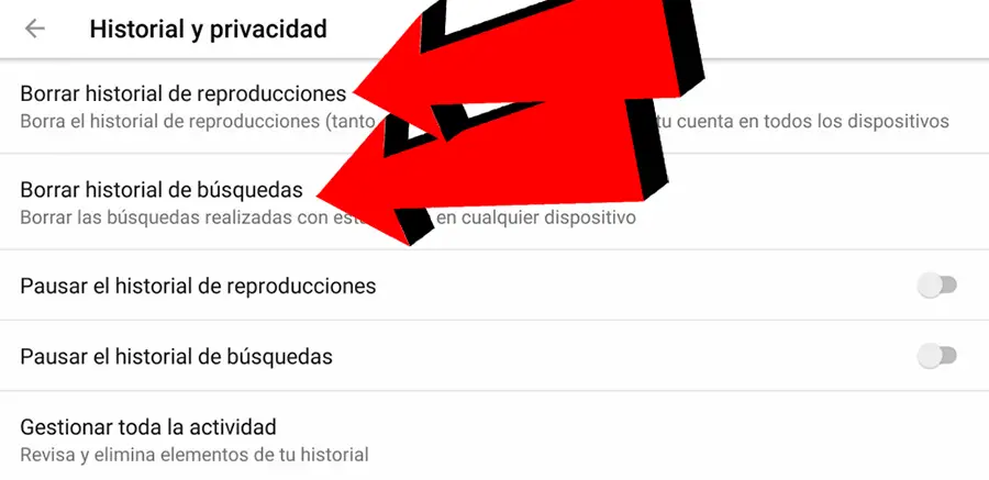 Une fois dans le menu Paramètres YouTube , nous devons rechercher l’entrée Historique et confidentialité , où nous verrons plusieurs options concernant notre historique de recherche et de lecture YouTube; Pour terminer l’opération, il suffit de cliquer sur les deux premières entrées de la liste, c’est-à-dire Effacer l’ historique de lecture et Effacer l’historique de recherche . Plus facile même que sur le site YouTube.
