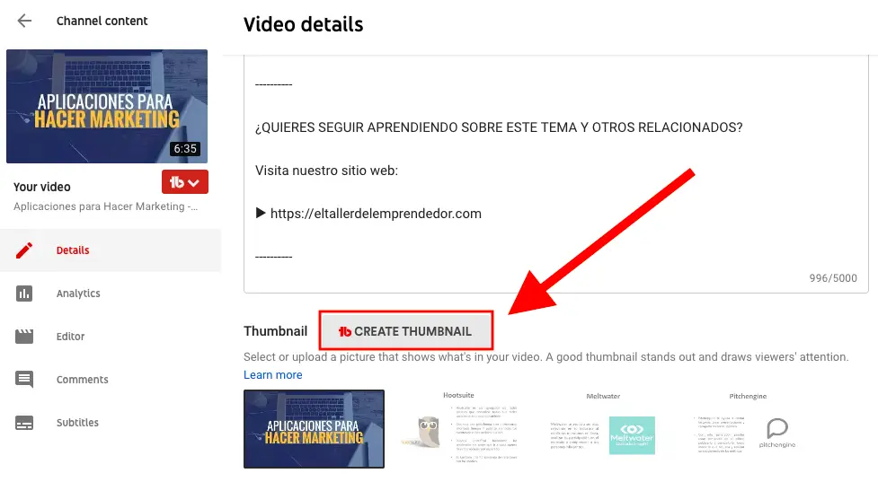 Ensuite, sur la page des détails de la vidéo, cliquez sur le bouton TubeBuddy » CRÉER UNE VIGNETTE » comme le montre l’image suivante :
