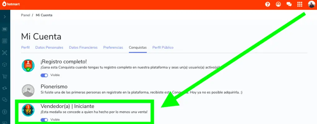 Chez Hotmart, lors de votre première vente, vous recevrez une conquête, comme le montre l’image ci-dessus. La vérité est que cela n’a pas de fonction particulière, mais c’est quelque chose de symbolique, qui marque un avant et un après pour vous…