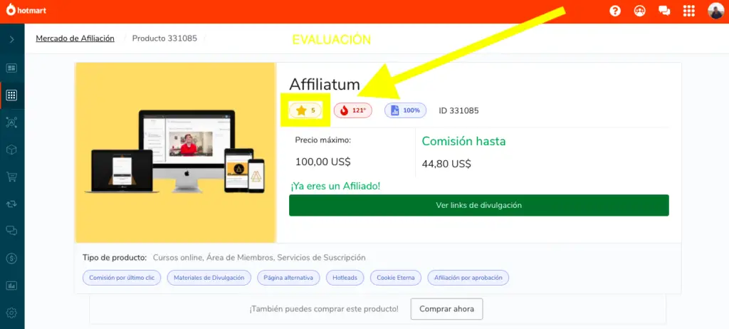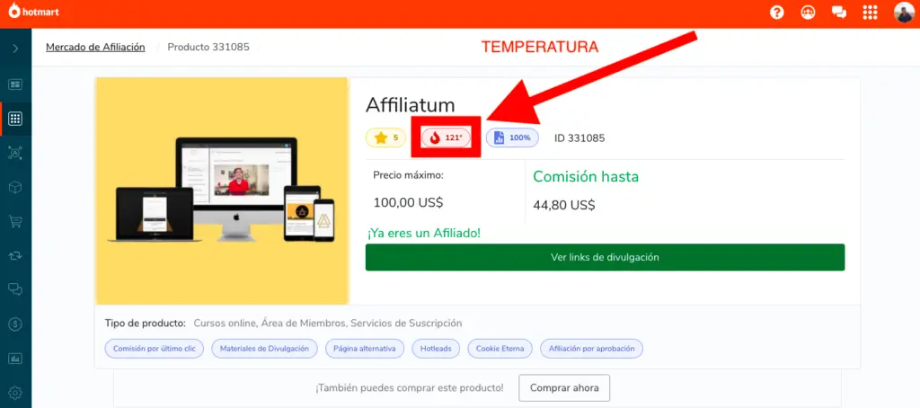 La «température» des produits d’information disponibles chez Hotmart indique brièvement combien ce produit se vend.