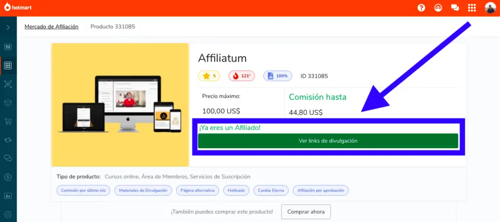 Comme le lien sur la page de vente, pour savoir s’il existe du matériel de support pour les affiliés, cliquez simplement sur le produit dans Hotmart puis cliquez sur le bouton » Voir les liens de sensibilisation «…